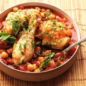 30-Minute Pressure Cooker Chicken with Chickpeas, Tomatoes, and Chorizo