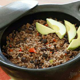 - Add rice, beans, water, cumin, bay leaf, oregano and salt and pepper.