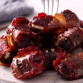 - Cut the bacon slices in half. Wrap each date with a slice of bacon and secure with a toothpick.