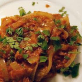 - 3. Remove the skin from the cooled down eggplant, and roughly chop the tender flesh. Add to the skillet along with the red chili powder, garam masala, tumeric, and the rest of the cumin. Cook for 5 minutes so all the flavors can mingle. Season to taste with salt and garnish with some cilantro.