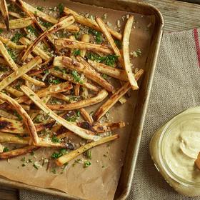 Baked Parsnip Fries with Curry-Lime Yogurt Dip