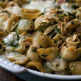 - Now sprinkle the bottom of baking dish with the rest of the zest. Add a layer of the pasta to the bottom of the baking pan, now sprinkle with some of the cheese, add more pasta, then more cheese. Finish with a layer of cheese. Cover with foil and bake for 30 minutes or until cheese on top is bubbly and melty. Serve sprinkled with the remaining almonds.