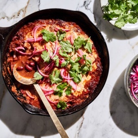- When the beans are ready, fish out the pickled onion slices and arrange on top, letting a few drops of the pickling liquid flick over the beans to season them. Garnish with cilantro and serve with hot rice, buttered toast or flour tortillas.