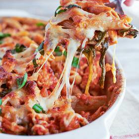 - Spoon pasta mixture into a lightly greased 13-by-9-inch baking dish. Sprinkle with cheese; bake for 35 minutes, or until hot and bubbly. Let rest 5 minutes. Sprinkle with basil before serving.