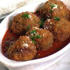 - Heat the Tomato Sauce in a saucepan. Spoon 1/4 cup sauce onto the center of each plate. Arrange 3 fried mushrooms on top of the sauce. Garnish each plate with chopped parsley and Parmesan.