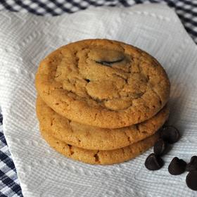 - 1. In a small bowl, whisk together flour, baking soda, baking powder, and salt; set aside. In the bowl of a stand mixer fitted with a paddle attachment, cream together butter, brown sugar, and sugar until light and fluffy, about 4 minutes. Add egg and vanilla and beat to combine. Beat in peanut butter. Add dry ingredients and stir until just combined. Stir in chocolate chips. Wrap dough in plastic wrap and chill in refrigerator for two hours.