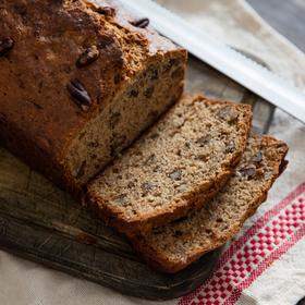 - 2. Combine flour, sugar, oat flour, baking powder, baking soda, salt, cinnamon, cloves, nutmeg, and coconut oil in the bowl of a stand mixer fitted with a paddle attachment. Mix on low until coconut oil disappears into a mealy powder. Add banana mash and continue mixing only until the floury bits disappear. Fold in nuts with a flexible spatula, scrape into prepared pan(s), and spread into an even layer. Bake until well risen and golden brown, or to an internal temperature of around 206°F (about 70 minutes for a large loaf or 45 for small). Wrapped tightly in foil, banana bread will keep up to 3 days at room temperature or 1 week in the fridge.