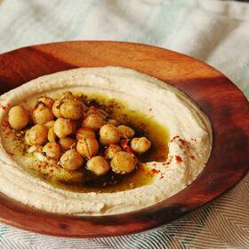 - 5. Serve hummus on a wide, shallow plate, drizzled with olive oil and sprinkled with za'atar, paprika, whole warm chickpeas, and/or chopped parsley. Leftover hummus can be stored in the refrigerator for up to 1 week. Allow to come to room temperature before serving.