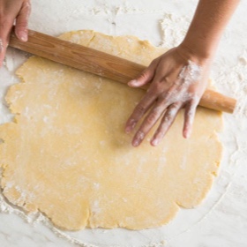- Pick up the dough by carefully rolling it around your rolling pin, using your bench scraper to help lift it off the work surface. Unroll it over a pie plate. Gently lift and fit the dough into the pie plate, getting down into the corners.
