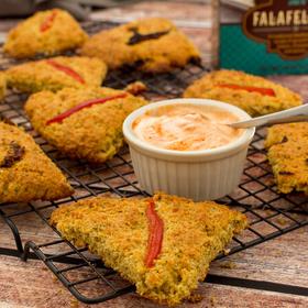 - In a large bowl, combine falafel mix, flour, sugar, and baking powder in a large bowl. Cut the butter into the dry ingredients until crumbly, leaving pea sized chunks of butter. Set aside.
