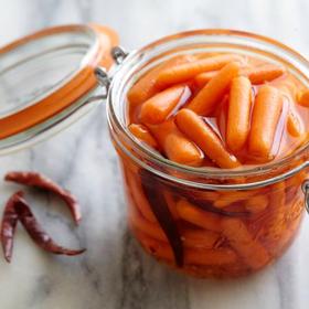 - Slowly pour the hot pickling liquid over the carrots, filling the jar to the top. Place the chilies in the jar. Allow the carrots to cool before sealing. Refrigerate for 2 days up to 1 week.
