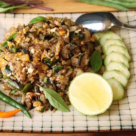- 4. Push rice to the side of wok and add remaining 1/2 tablespoon oil. Break egg into oil and season with a little salt. Use a spatula to scramble egg, breaking it up into small bits. Toss egg and rice together.