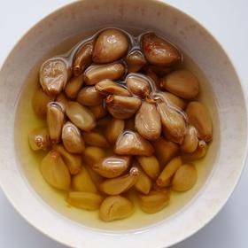- Preheat oven to 250°. Place garlic and oil in a small ovenproof saucepan (add more oil if cloves aren’t submerged). Cover and bake until cloves are golden and tender, about 2 hours. Let cool; transfer garlic and oil to an airtight container and chill.Do Ahead: Garlic can be cooked 2 weeks ahead. Keep chilled. Bring to room temperature before using.