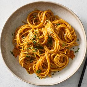 - Transfer the sauce to the pot with the spaghetti and add the remaining 2 tablespoons butter. Vigorously stir until the butter melts. Add splashes of the pasta cooking water, as needed, to thin out the sauce. Taste and season with salt and pepper. Top with the cilantro or scallions (if using) and serve immediately.
