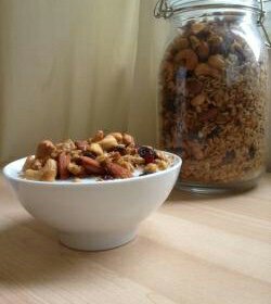 - 2. Bake, stirring every 15 minutes or so, until the granola has begun to turn crisp and brown, about 45 minutes. (It will continue to crisp up as it cools.) Let cool for at least 15 minutes, then stir in the raisins and cranberries, if you’re using them. Serve with milk or yogurt if you like. (Store unused granola in an airtight container at room temperature for up to a month.)