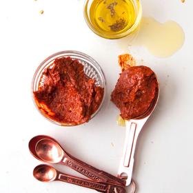 - Drain chiles and transfer to the bowl of a food processor with the ground spices, olive oil, salt, garlic, and lemon juice. Purée, stopping occasionally to scrape down the sides of the bowl, until the paste is very smooth, about 2 minutes. Transfer to a sterilized 1-pint glass jar and fill with oil until ingredients are submerged by 1/2". Refrigerate, topping off with more oil after each use. Harissa paste will keep for up to 3 weeks.