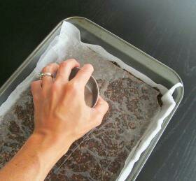- Pour "dough" into a parchment lined 9"x13" pan and spread and press with a rubber spatula as evenly as possible, attempting to fill the whole pan and reach the edges. Lay a piece of parchment or wax paper over fruit bar mixture, and over the top of the wax paper, use a flat bottomed cup (I used my measuring cup), to flatten the bars evenly and smooth the mixture to the edges.