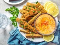- 5. Sprinkle hummus fries and spicy tahini sauce with paprika and chopped parsley. Serve immediately.