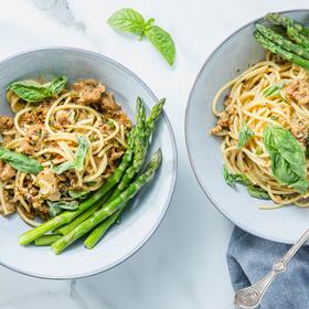 - Divide the lemon basil spaghetti between bowls. Top with remaining sausage and leek mixture and serve with asparagus. Bon appétit!