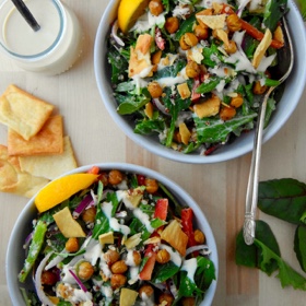 - To serve, top salad with chickpeas and crumbled pita chips.