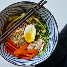 - Lastly, prepare the noodles and get ready to assemble. Bring a 4-quart pot of water to boil. Cook noodles according to package directions (roughly 5–7 minutes, until they’re loose and al dente.) Ladle noodles into bowls, cover with broth, and add a bit of chicken, 2 egg halves, scallions, bok choy, pickled carrots, black sesame seeds and togarashi, to taste.