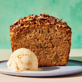 - Using a spatula, stir bananas into the batter to combine evenly. Add half of the pecans (and any salt on the pan) to the batter and mix to combine evenly throughout. Add batter to the loaf pan, smoothing when complete. Sprinkle the remaining pecans evenly on top.