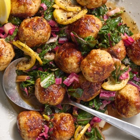 - Use a soup ladle to scoop up the meatballs, resting them on the greens, browned-side up and ladling any juices on top of the meatballs and greens. Cut the remaining lemon into wedges for serving, if desired.