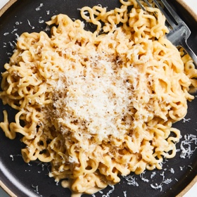 - Add the peanut butter, butter, Parmesan and soy sauce. Vigorously stir the noodles for a minute, adding some reserved cooking water, a tablespoon or two at a time, until the sauce is glossy and clings to the noodles. Season to taste with salt.