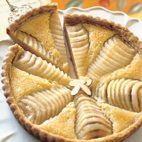 - Spread almond filling evenly in crust. Stem pears and cut each in half lengthwise; scoop out cores. Cut each half crosswise into thin slices. Gently press each pear half to fan slices but keep slices tightly overlapped. Slide spatula under pears and arrange atop filling like spokes of wheel with narrow ends in center.
