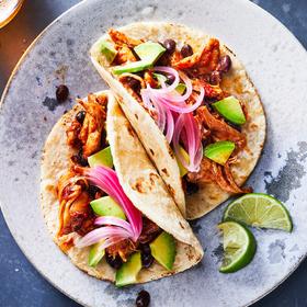 - Stir in the black beans and a squeeze of lime juice, set to sauté and let the beans warm through, 2 to 3 minutes. Taste and add more salt or lime juice if necessary. Serve in tortillas with pickled onions and avocado.