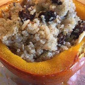- Combine quinoa, onion, garlic, pecans, cranberries, thyme, and sage
