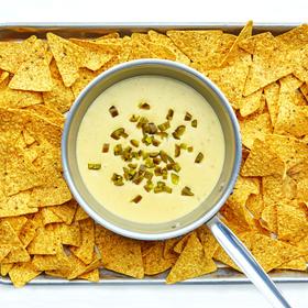 - Arrange chips on a platter or baking sheet. Serve queso right out of the pot so it stays warm and can be easily reheated over medium-low heat if needed. If you’re feeling real extra, set pot over another pot or large bowl filled with hot water so it stays gooey for longer.