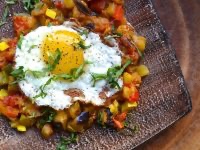 - 3. Heat remaining oil in now-empty skillet over medium-high heat until shimmering. Add eggs and fry until whites are set and yolk is runny. Top each plate with and egg, season with salt and pepper, sprinkle with remaining basil, and serve.