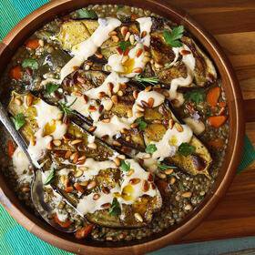 Roasted Eggplant with Tahini, Pine Nuts, and Lentils