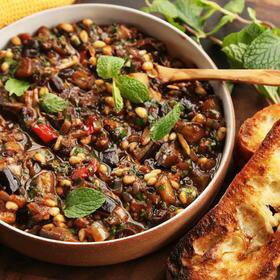 - 4. Add reserved pine nuts, mint, parsley, tomato paste, ground cinnamon, raisins, capers, sugar, red wine vinegar, and balsamic vinegar and toss to combine. Drizzle in remaining olive oil and bring to a simmer, adding water a tablespoon at a time as necessary until caponata has a sauce-like consistency that is loose, but doesn't run freely over a plate. Season to taste with salt and pepper.