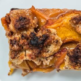 - Cut peaches and layer tightly. Crumble the remaining 1/4 dough mixture over your peach layer.