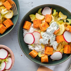 - Divide the cooked jasmine rice between bowls. Top with summer squash, spicy Buffalo tofu, and celery radish salad. Drizzle with herbed ranch dressing. Dig in!