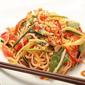 - In a large bowl, combine peanut butter, soy sauce, chili sauce, lime juice, sesame seed oil, garlic, sugar or honey, and water. Whisk until homogeneous. Drain noodles thoroughly and add to bowl. Add bell peppers, cucumber, bean sprouts, basil leaves, scallions, jalapeños, and bird chilis (if using). Toss to combine. Serve immediately, topped with roasted peanuts.