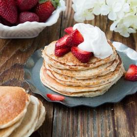 - Lightly butter or grease a griddle over medium heat. Pour ⅓ cup scoops onto the griddle and cook for a minute or two or until the bubbles form on top. Flip and cook again until set. Serve with fresh strawberries and fresh whipped cream (heavy cream whipped until soft peaks begin to form, add powdered sugar a little at a time while beating until peaks form and the mixture is lightly sweetened.)