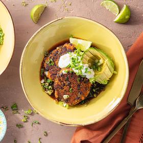 - Add lime zest, lime juice, and sour cream to a small bowl, and mix to combine the lime crema. Divide the poblano tinga between plates. Drizzle with lime crema. Top with sweet potato black bean cakes. Add sliced avocado and sprinkle with sliced scallion. Serve with lime wedges. Enjoy!