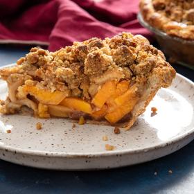 - 12. Place pie on a parchment-lined half-sheet tray. Bake to an internal temperature of around 195°F (91°C) in the very center, about 1 hour 15 minutes (if crumble topping starts to darken beyond chestnut brown in color, loosely cover pie with aluminum foil for remainder of baking time).