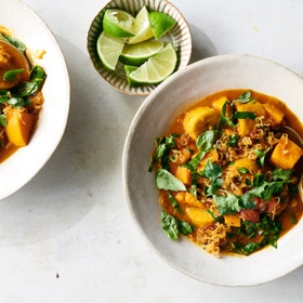 - To serve, remove and discard the cooked chile. Ladle the curry into bowls, top with the caramelized shallots, a scattering of basil and cilantro, and several squeezes of lime juice.